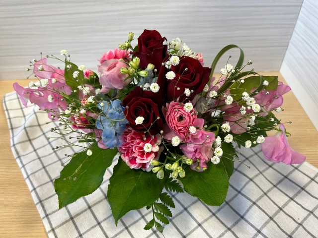 御祝アレンジ ブロンズ バラを入れたミックスアレンジメント E22