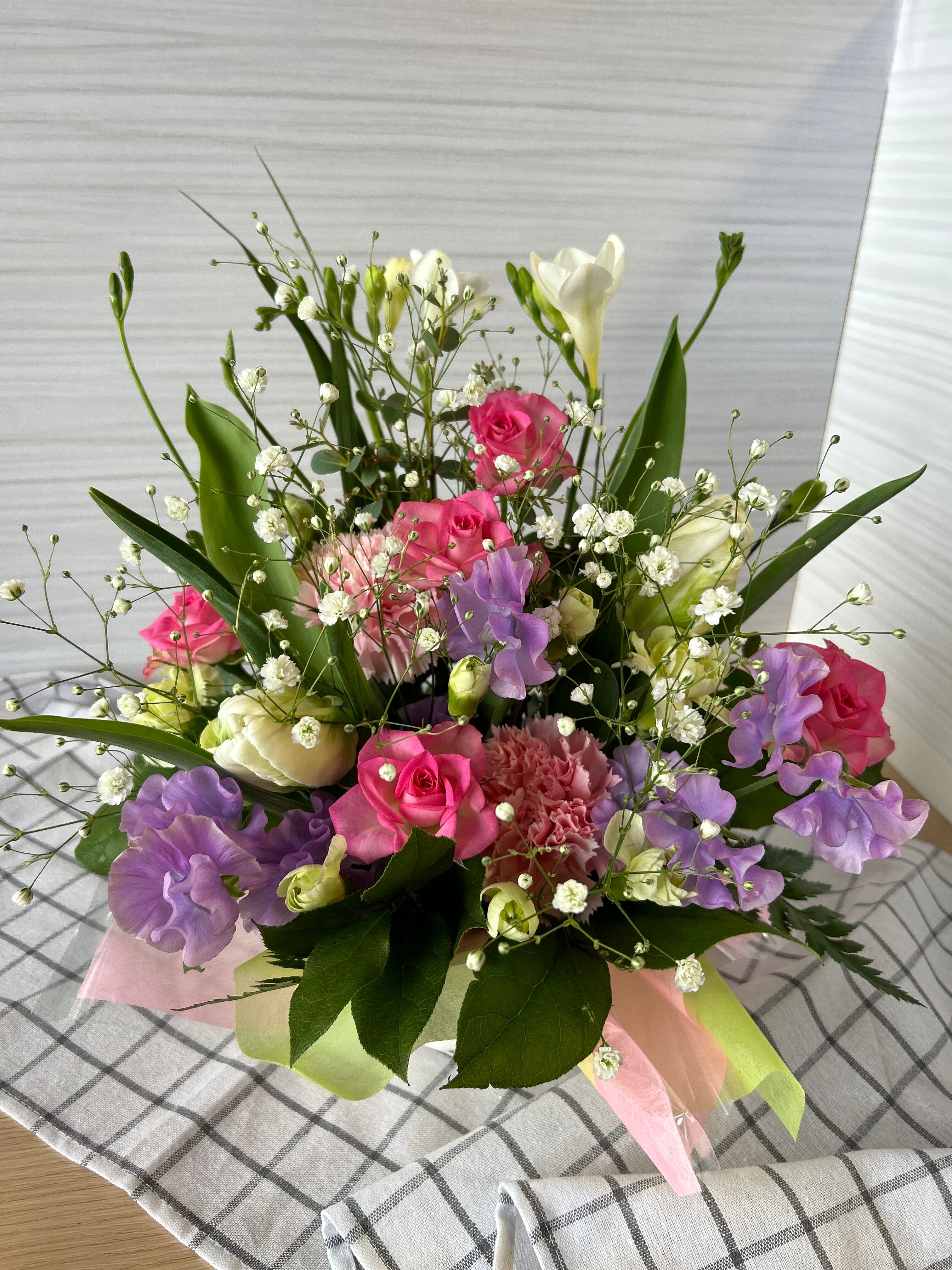 品名:御祝アレンジ シルバー 季節のお花を入れたボリュームのあるアレンジメント E24