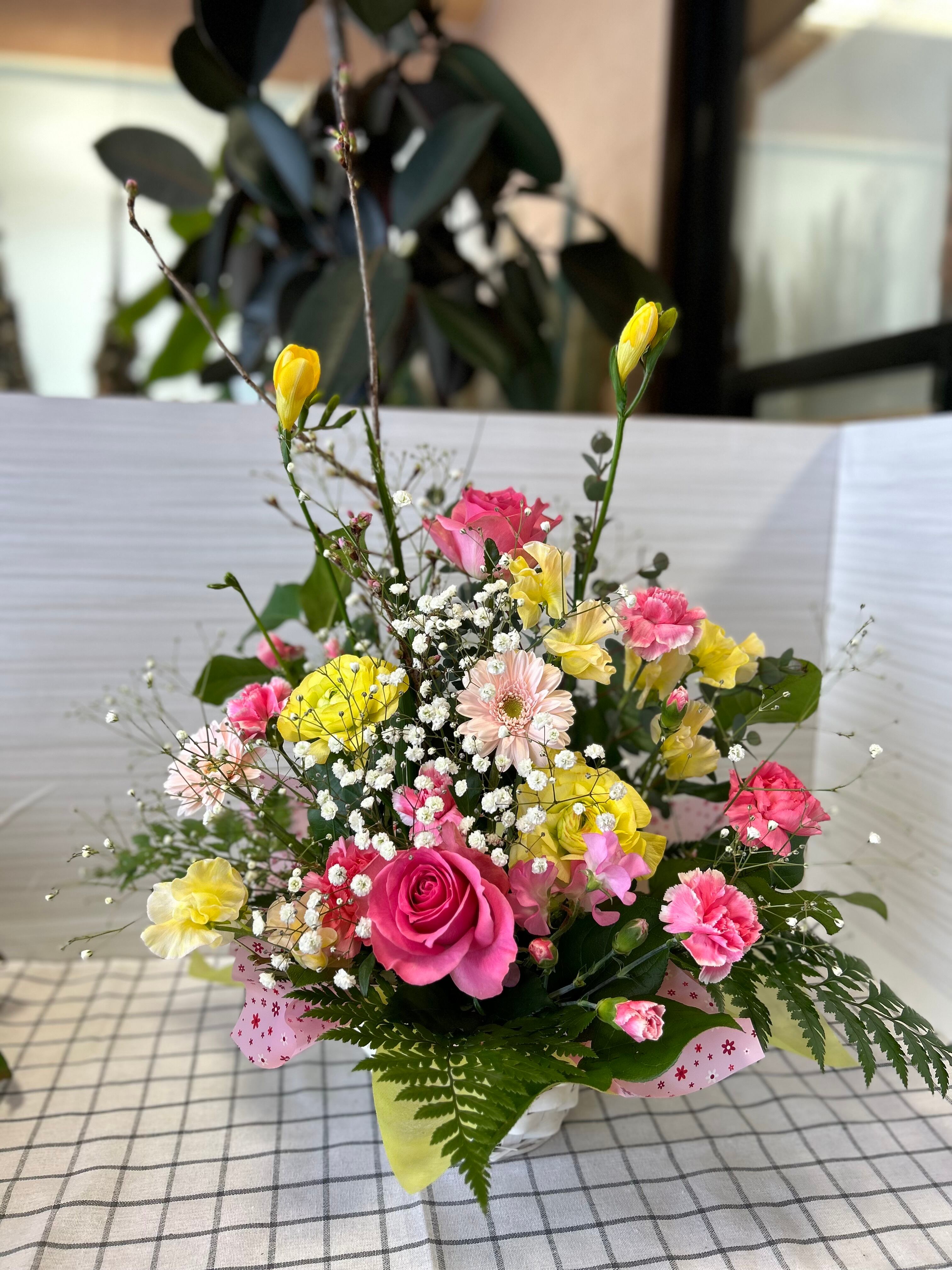 御祝アレンジ シルバー 季節のお花を入れたボリュームのあるアレンジメント E25
