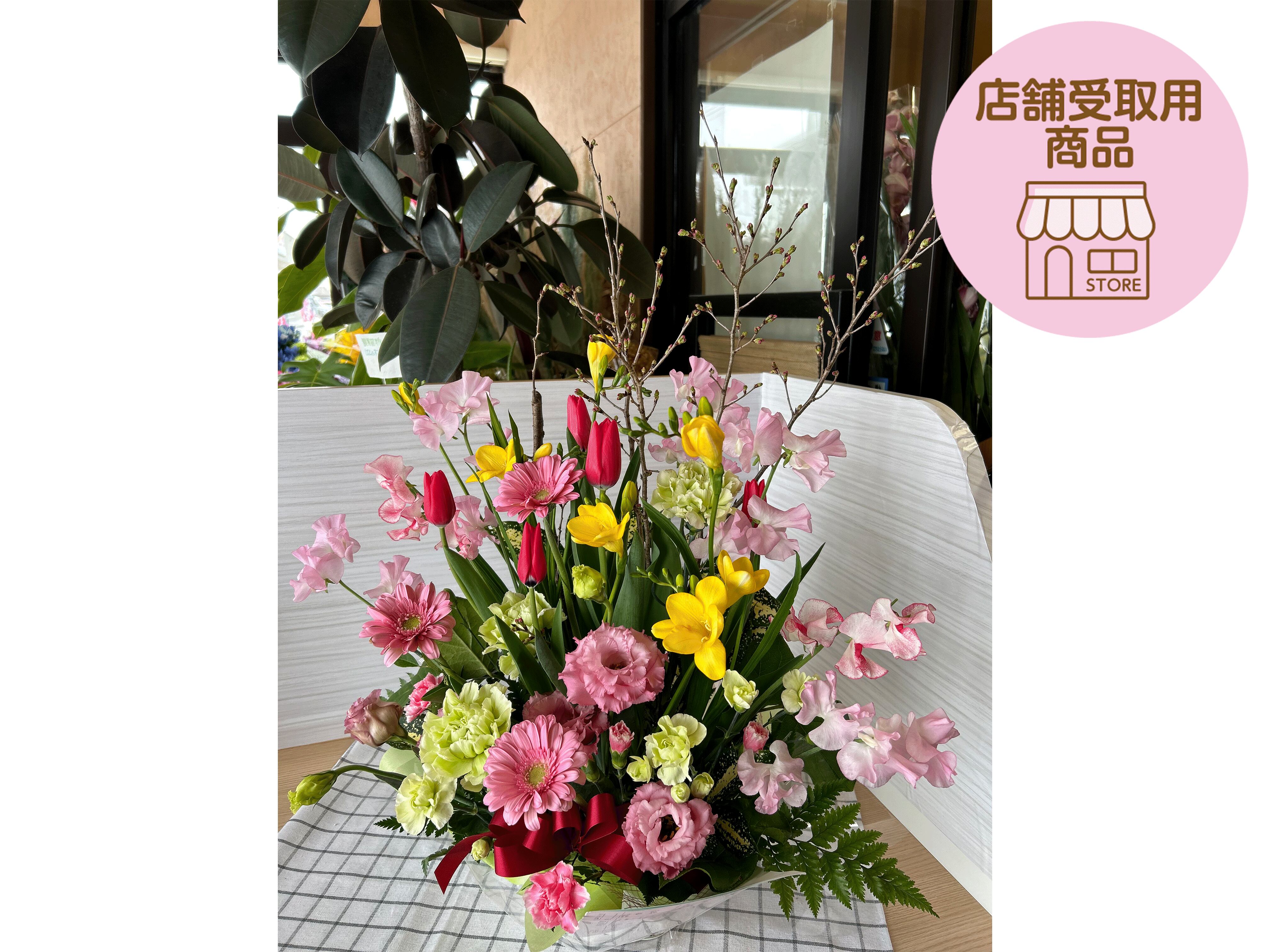 【店舗受取】御祝アレンジ ゴールド 季節のお花を入れたボリュームのあるミックスアレンジメント E26